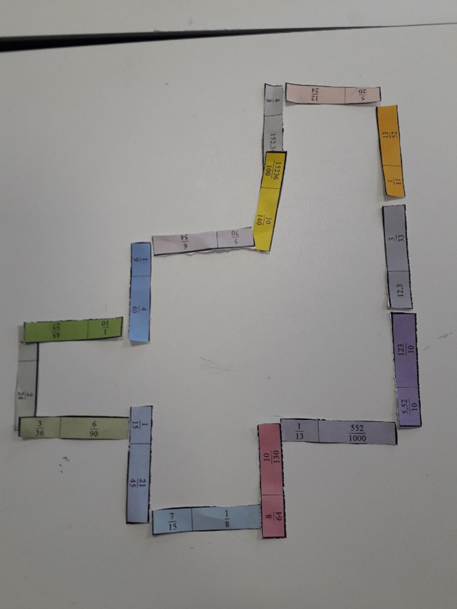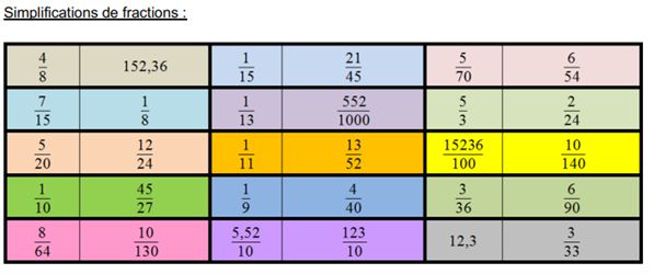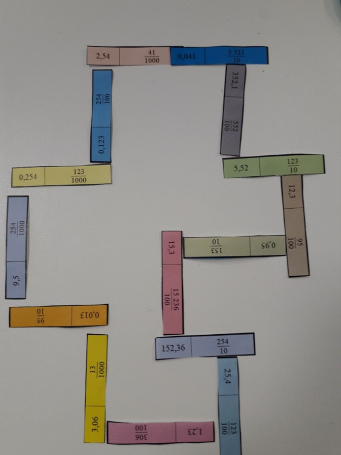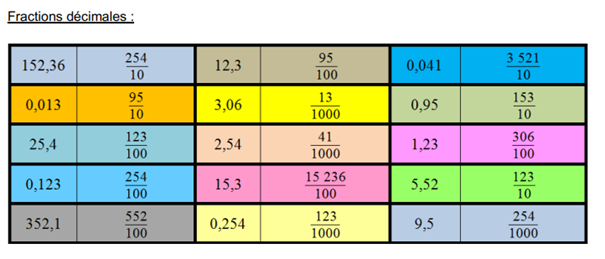 Le but était de découper les vignettes et de jouer une partie de dominos avec les fractions. Ils ont pu ainsi restituer leurs savoirs sur les nombres décimaux, les fractions décimales et la simplification des fractions tout en jouant.